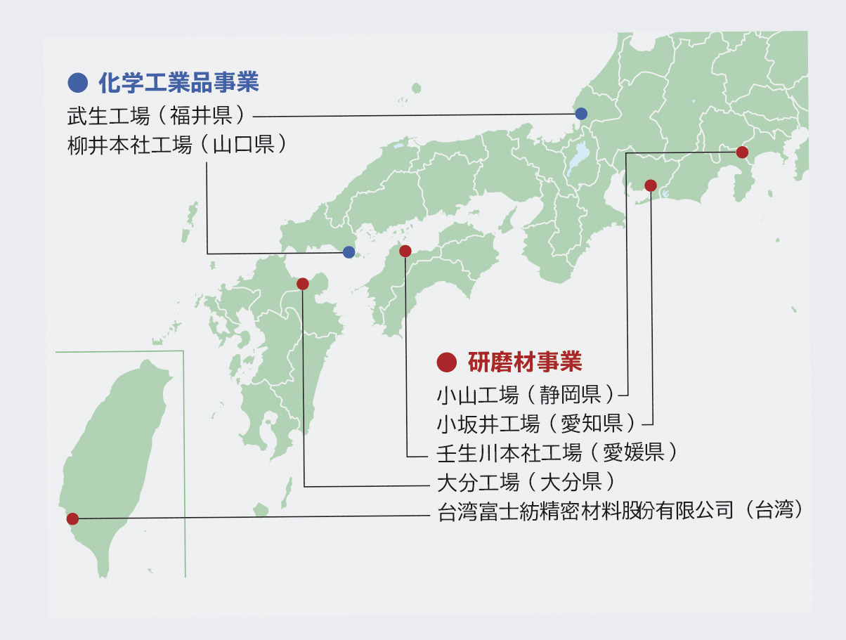 研磨材事業、化学工業品事業とも、BCP の要諦である複数拠点化に取り組んでいます。